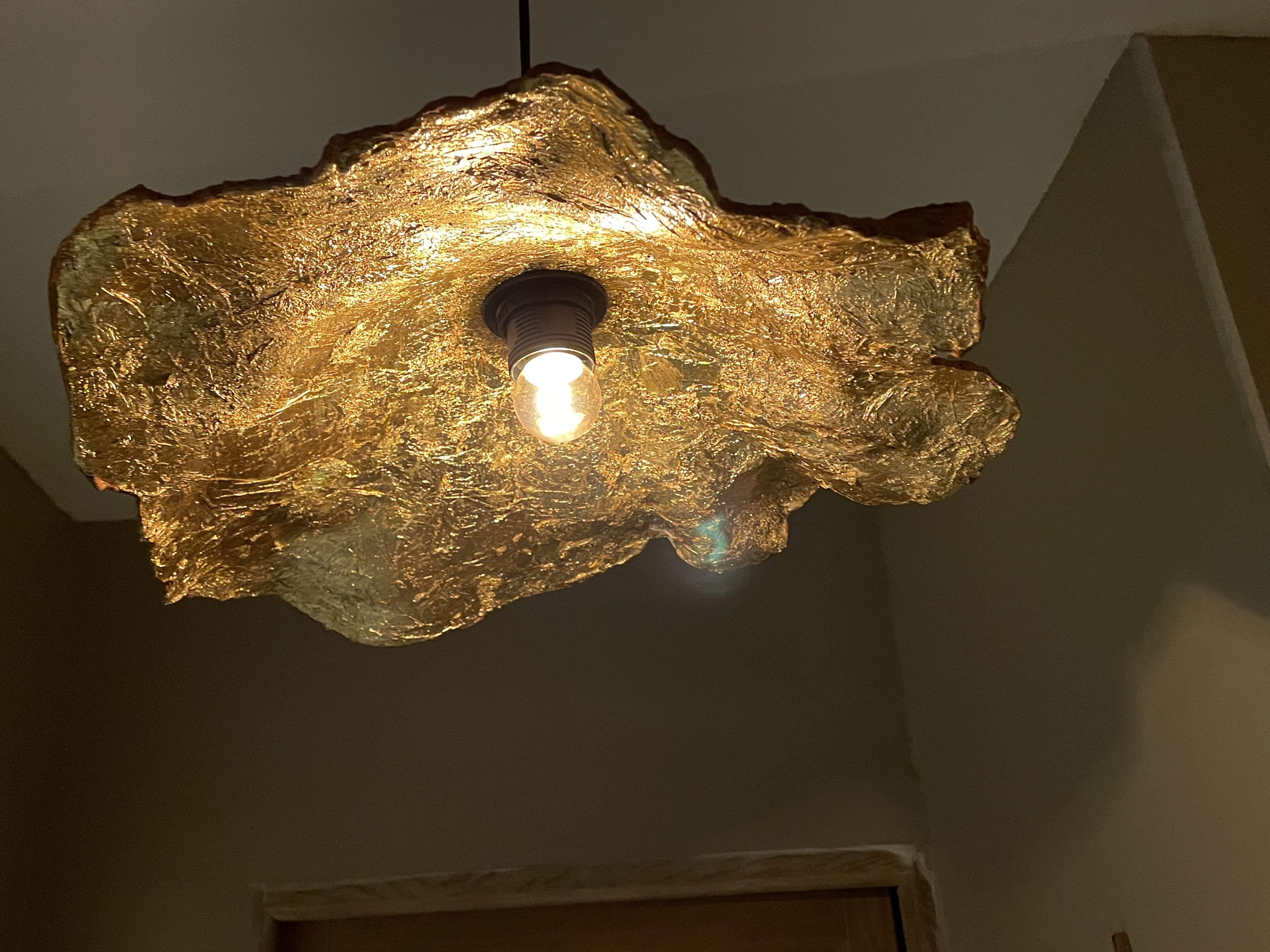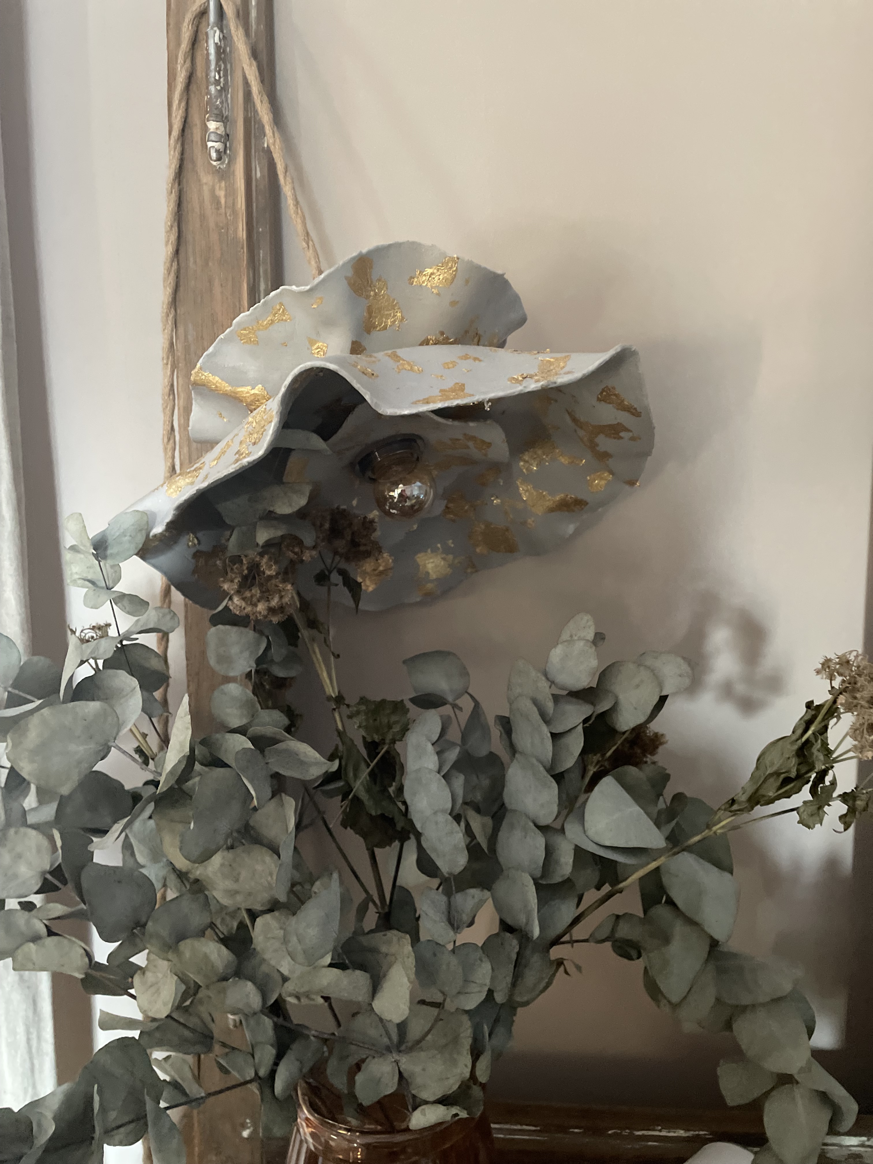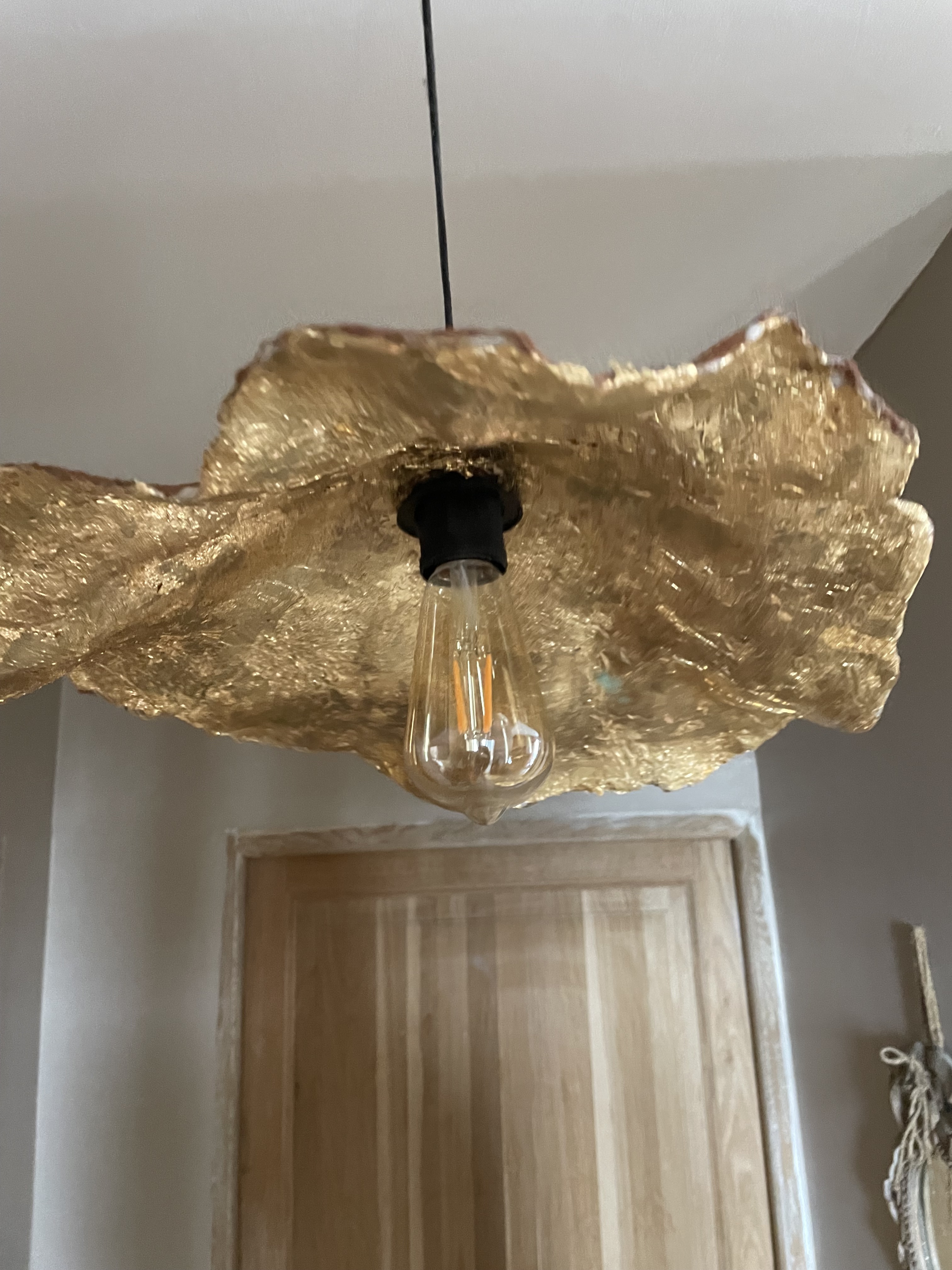 Apporter de la texture à votre intérieur. Possibilité de l’installer comme lustre ou comme point d’éclairage excentré pour mettre en valeur un meuble, un objet… . Gris clair & rajout de feuilles dorées.