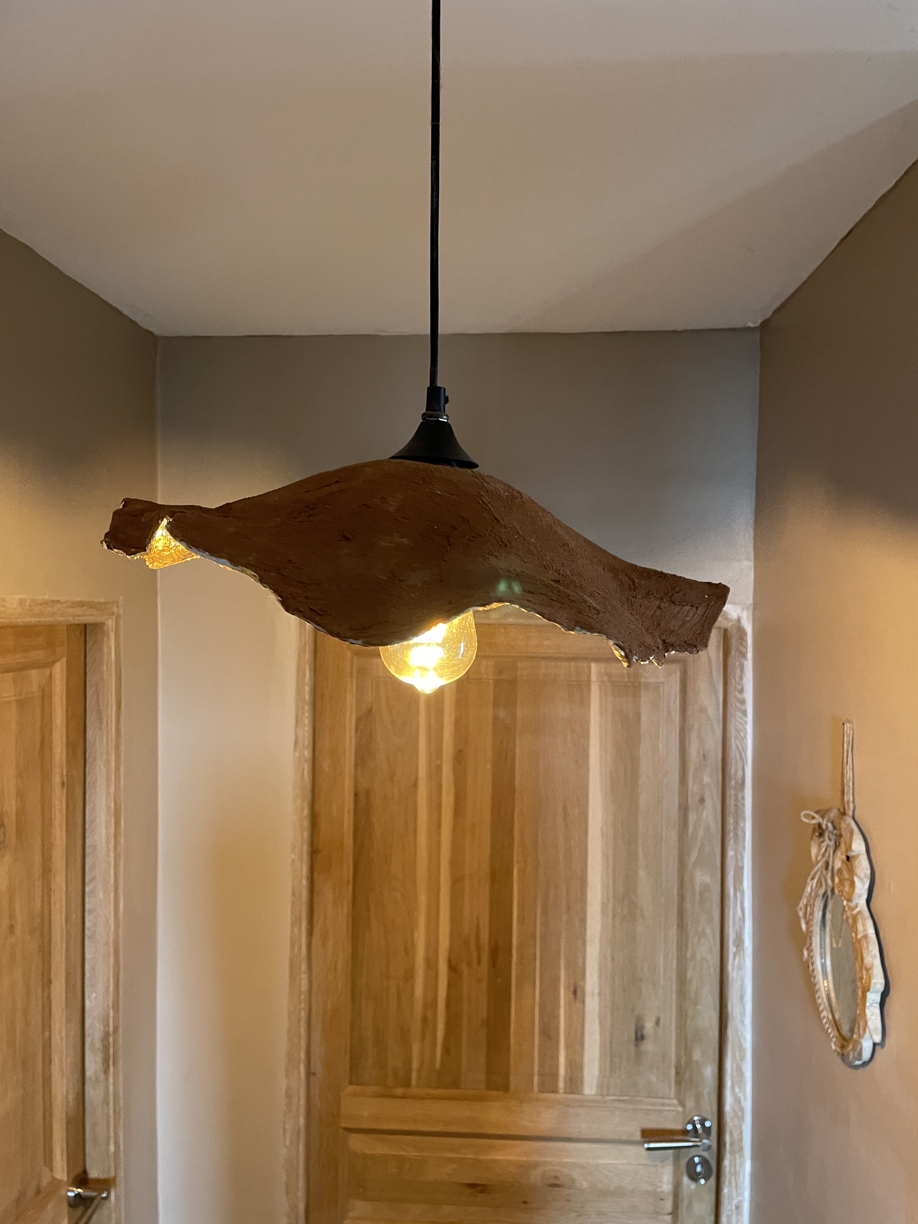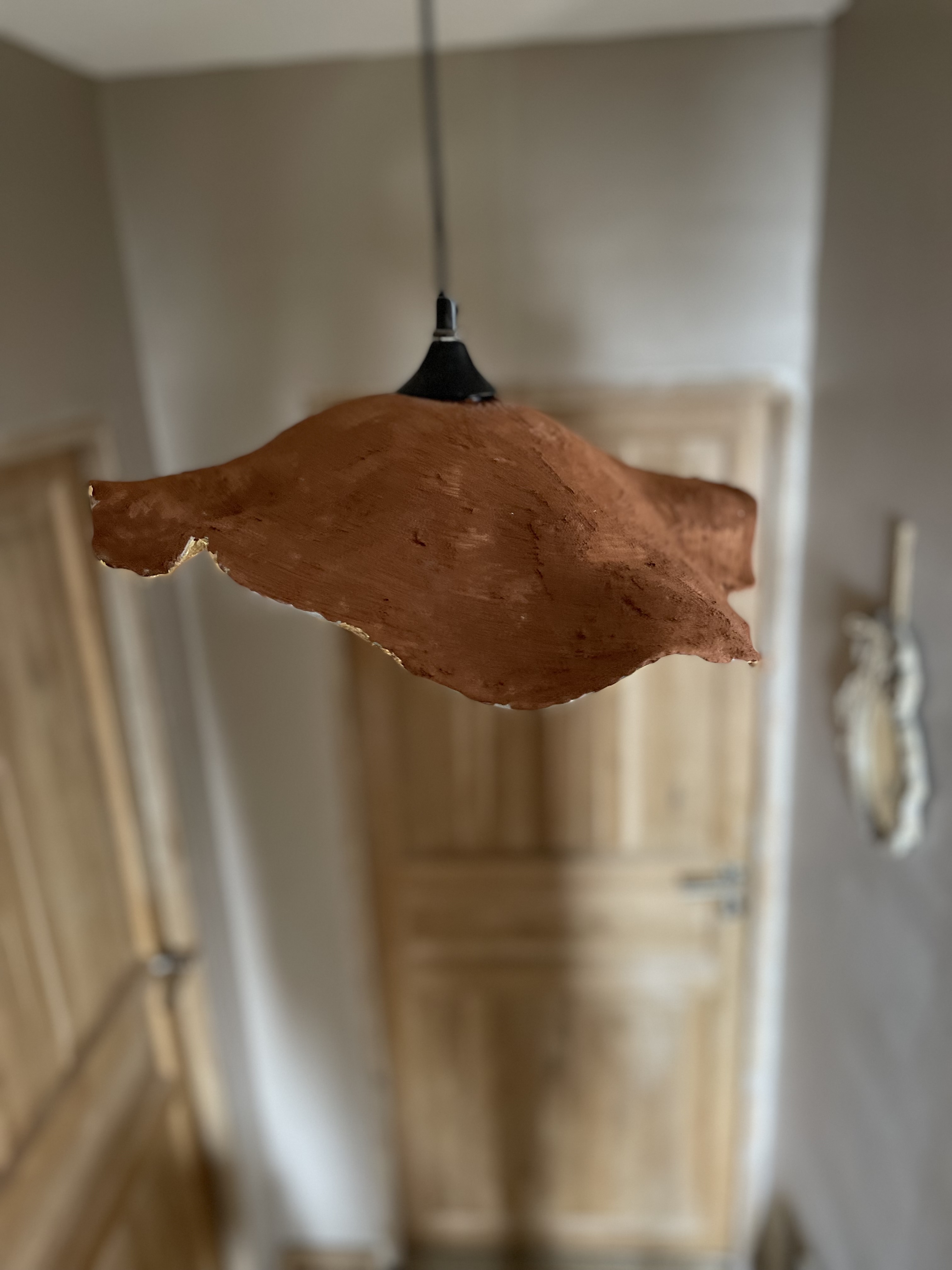 Suspension Terra cotta texturé & feuilles dorées. Une note d’authenticité avec cette suspension qui réchauffera votre intérieur avec sa lumière douce.