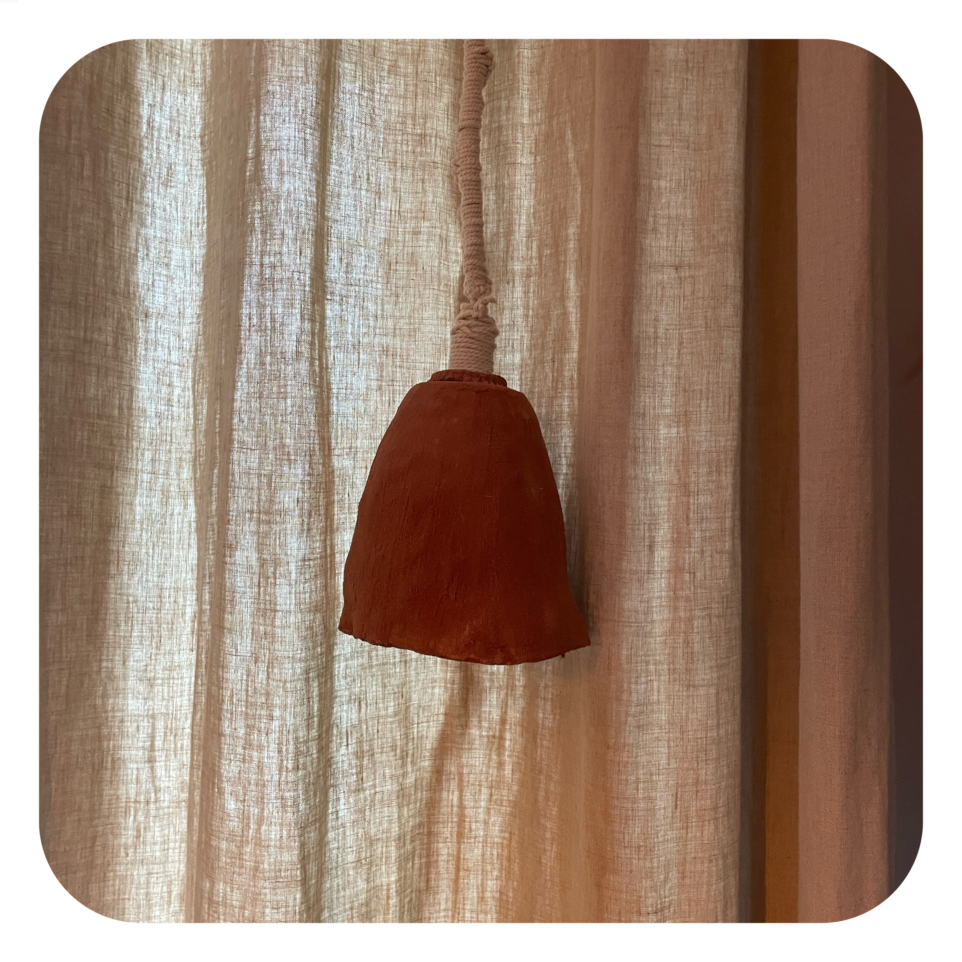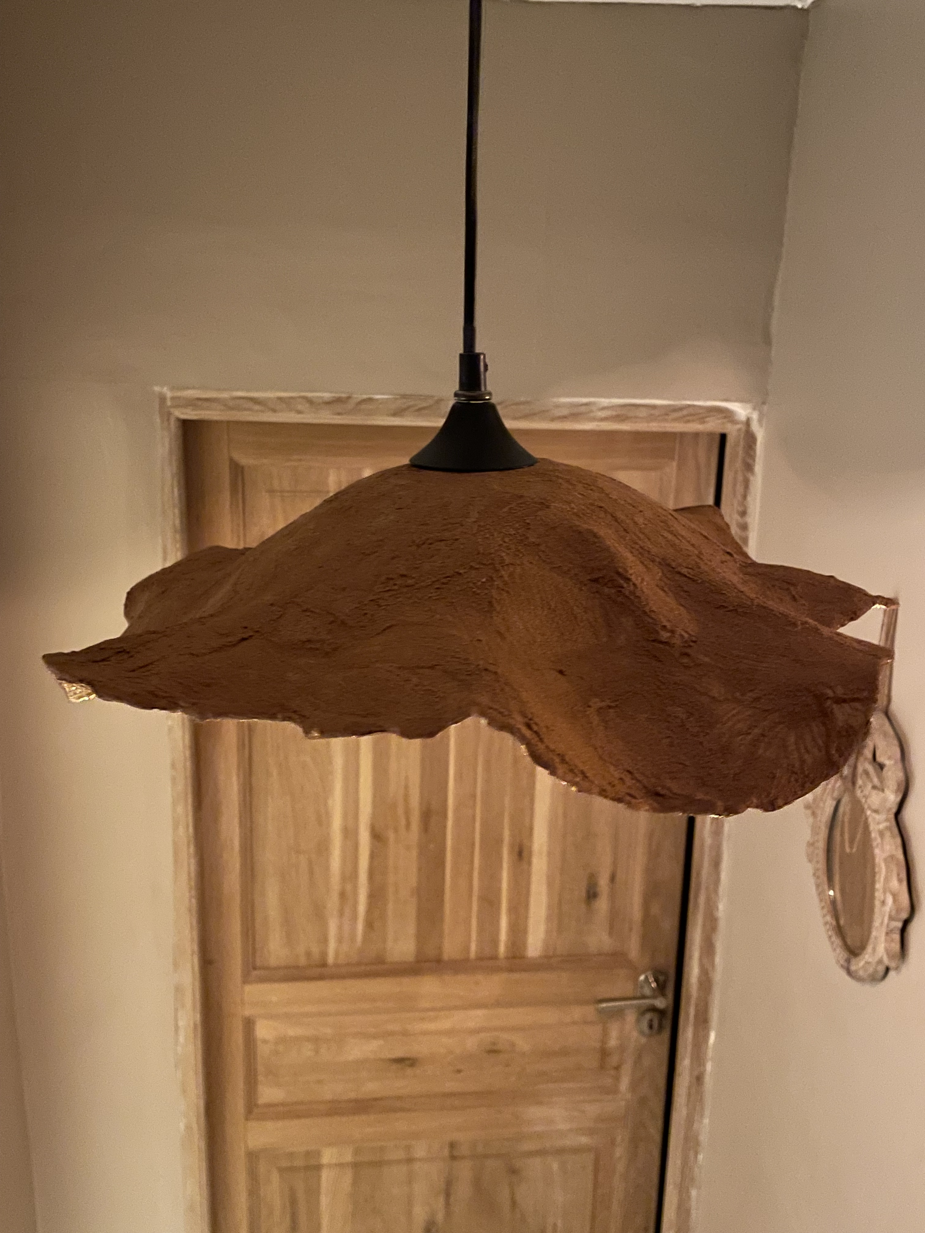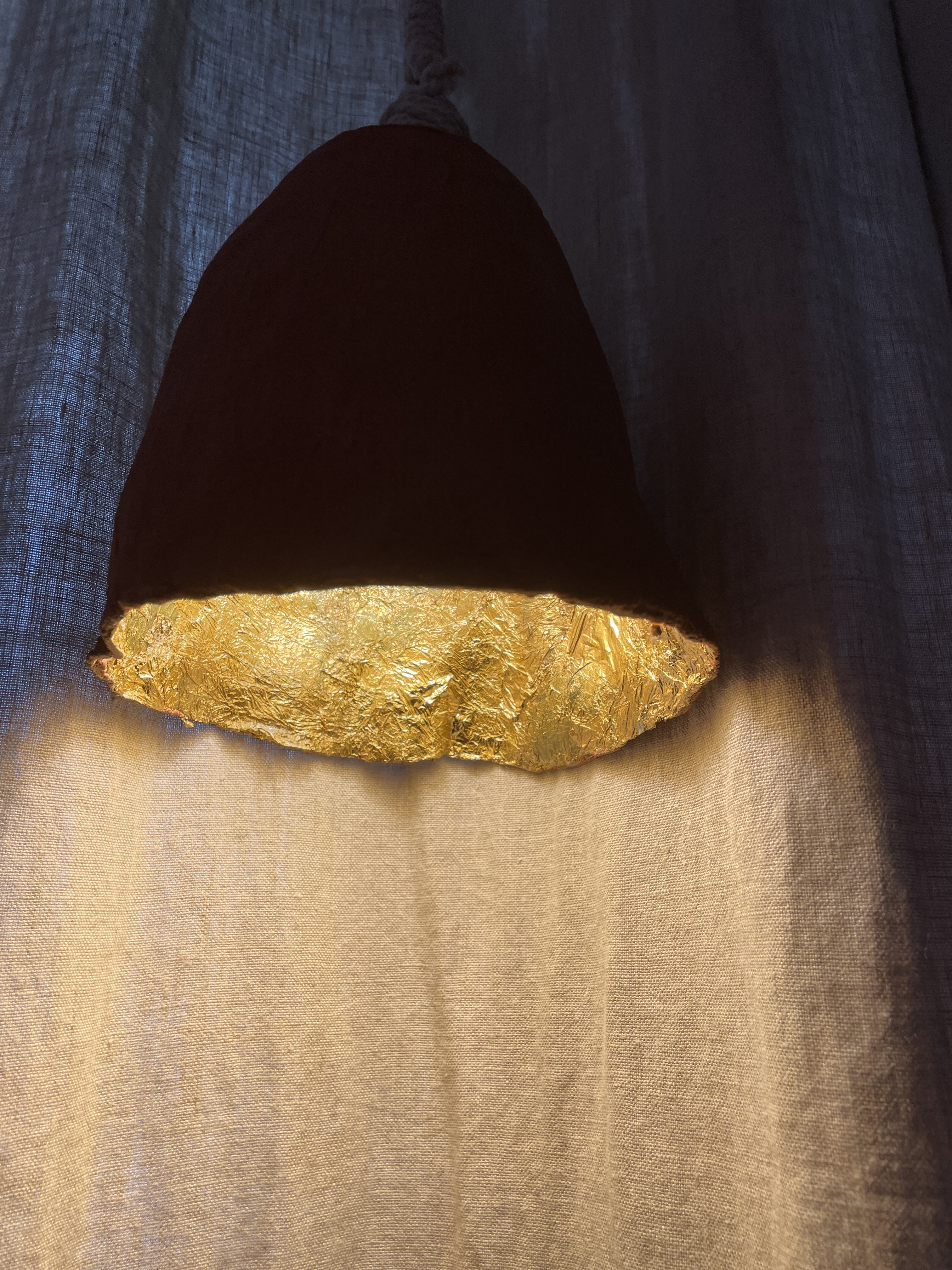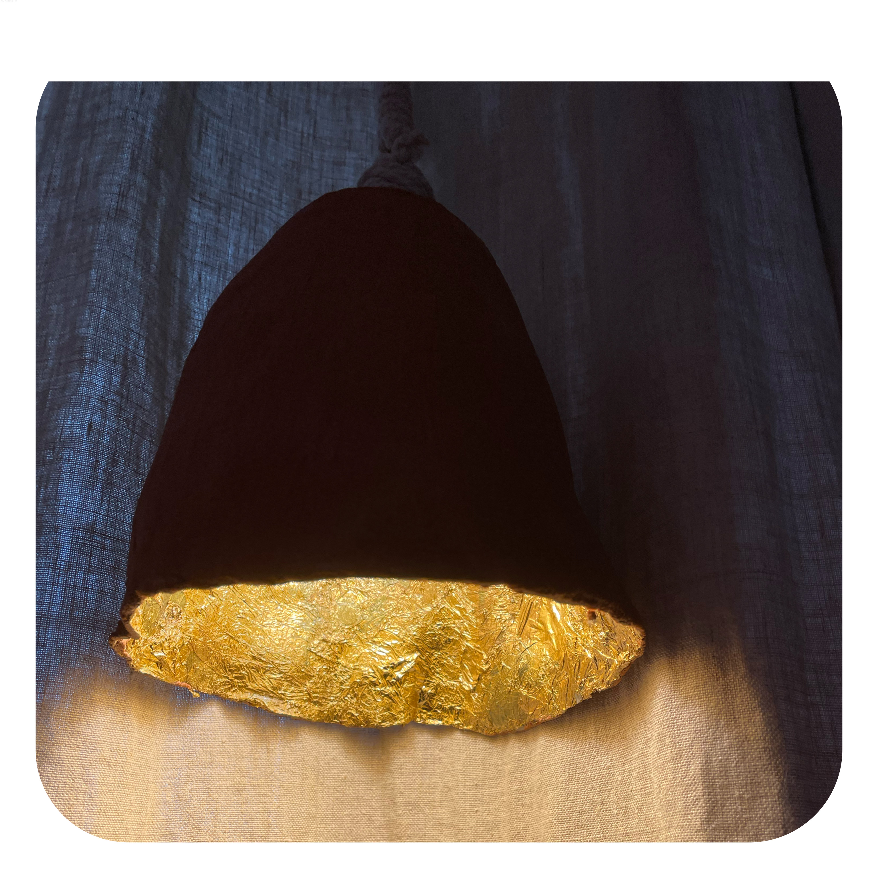 Lampe baladeuse terra cotta, peinture mélangée à du bicarbonate pour un effet texturé. L’intérieur est recouvert de feuille de papier doré.