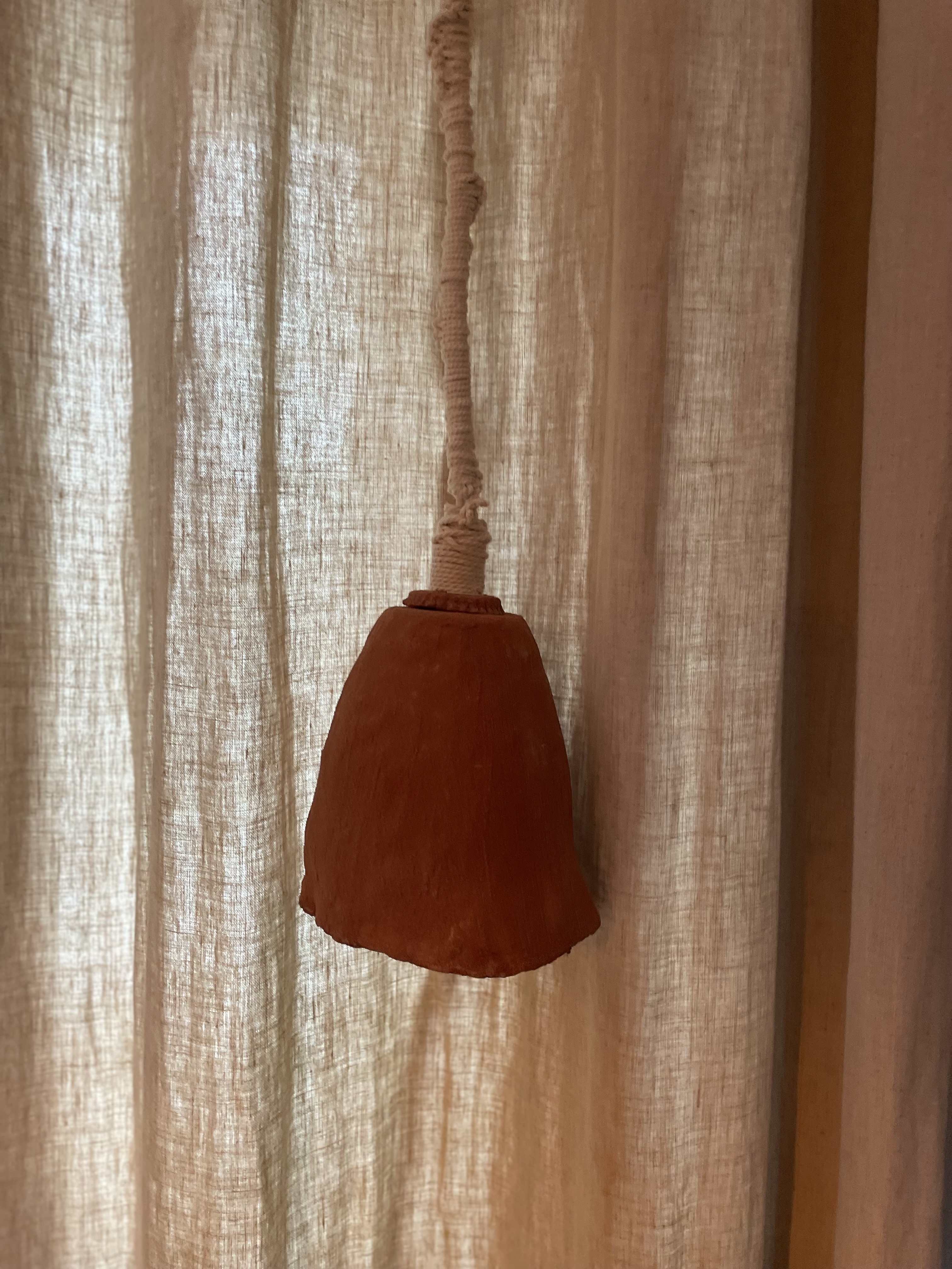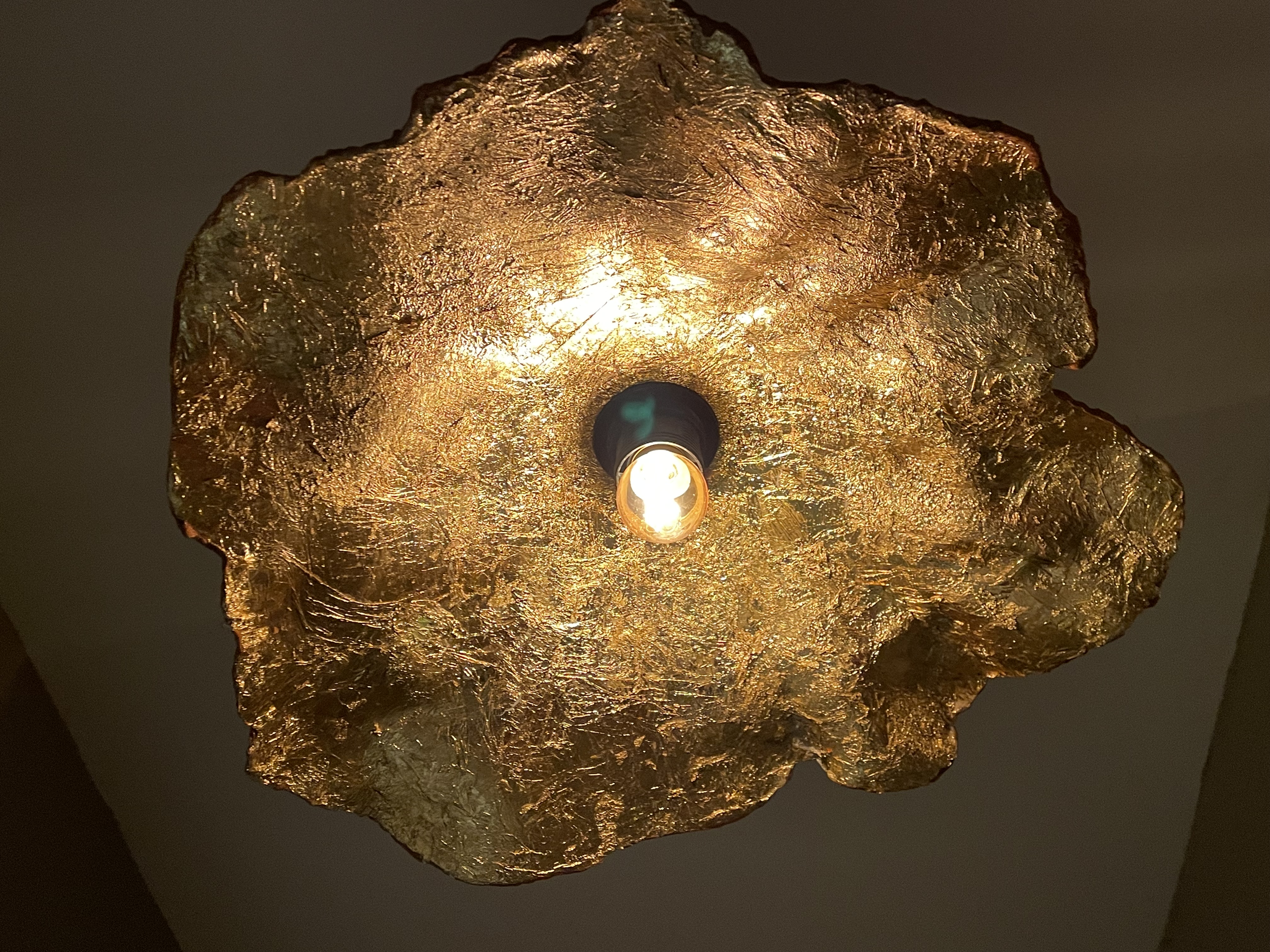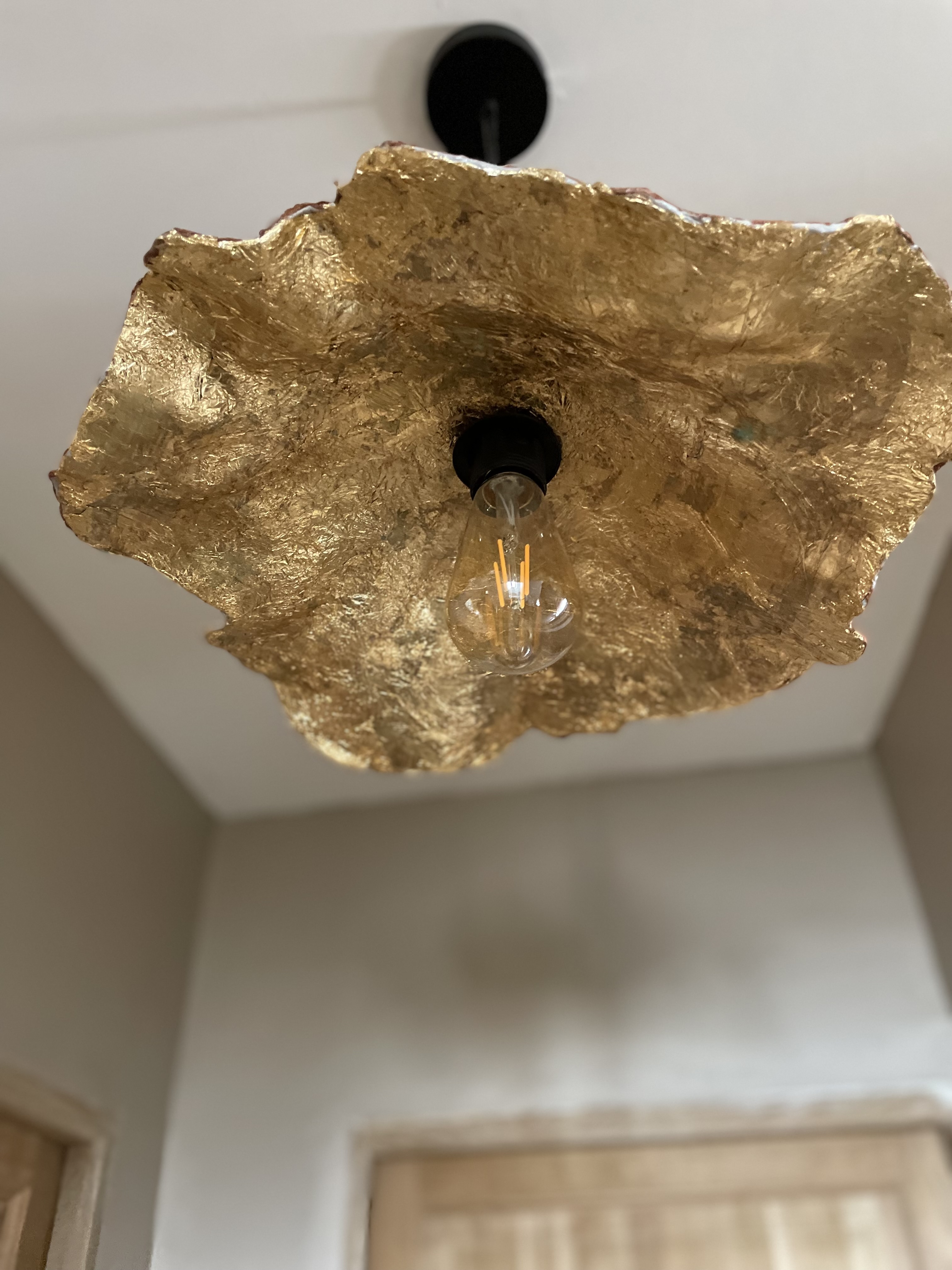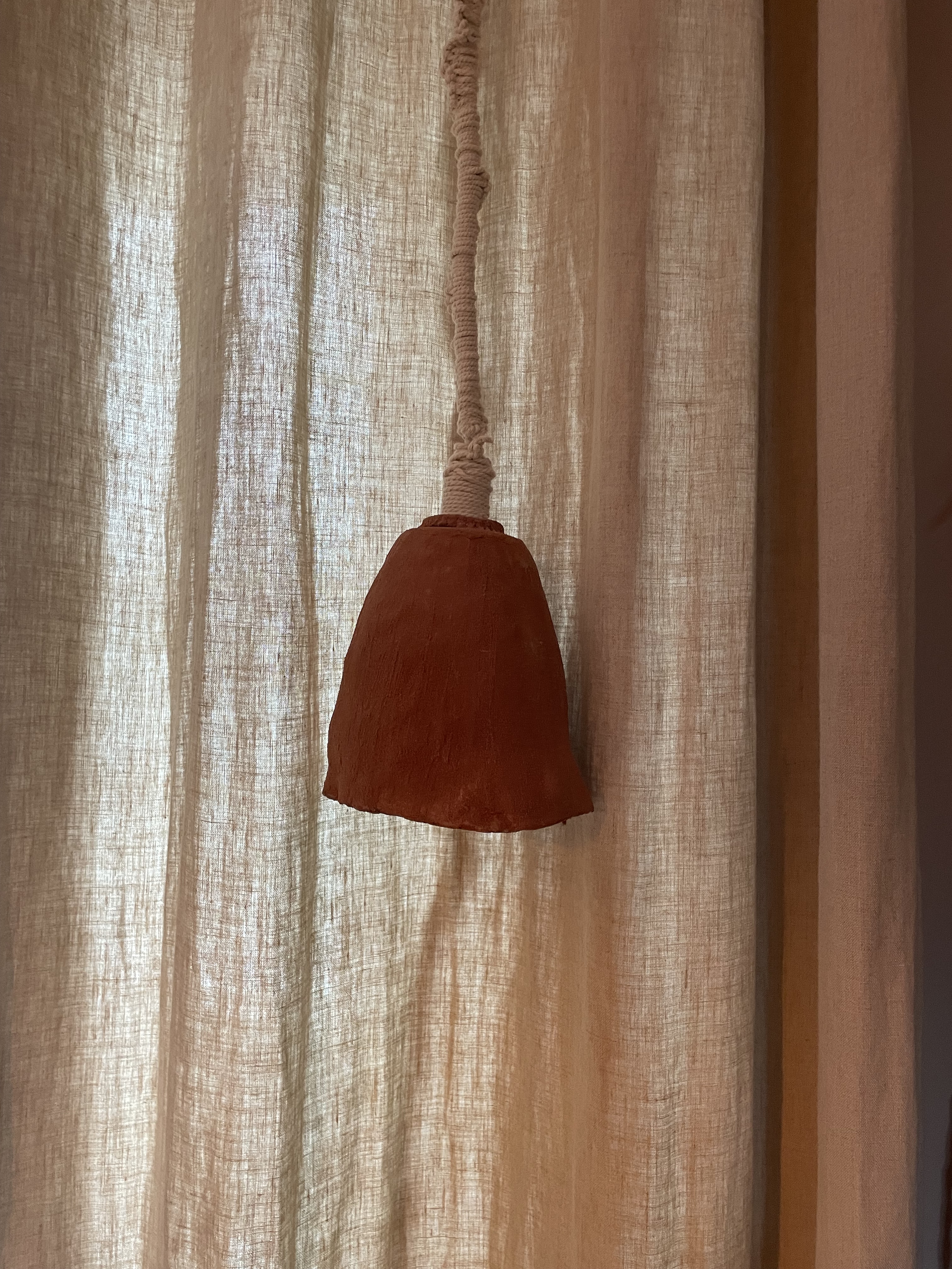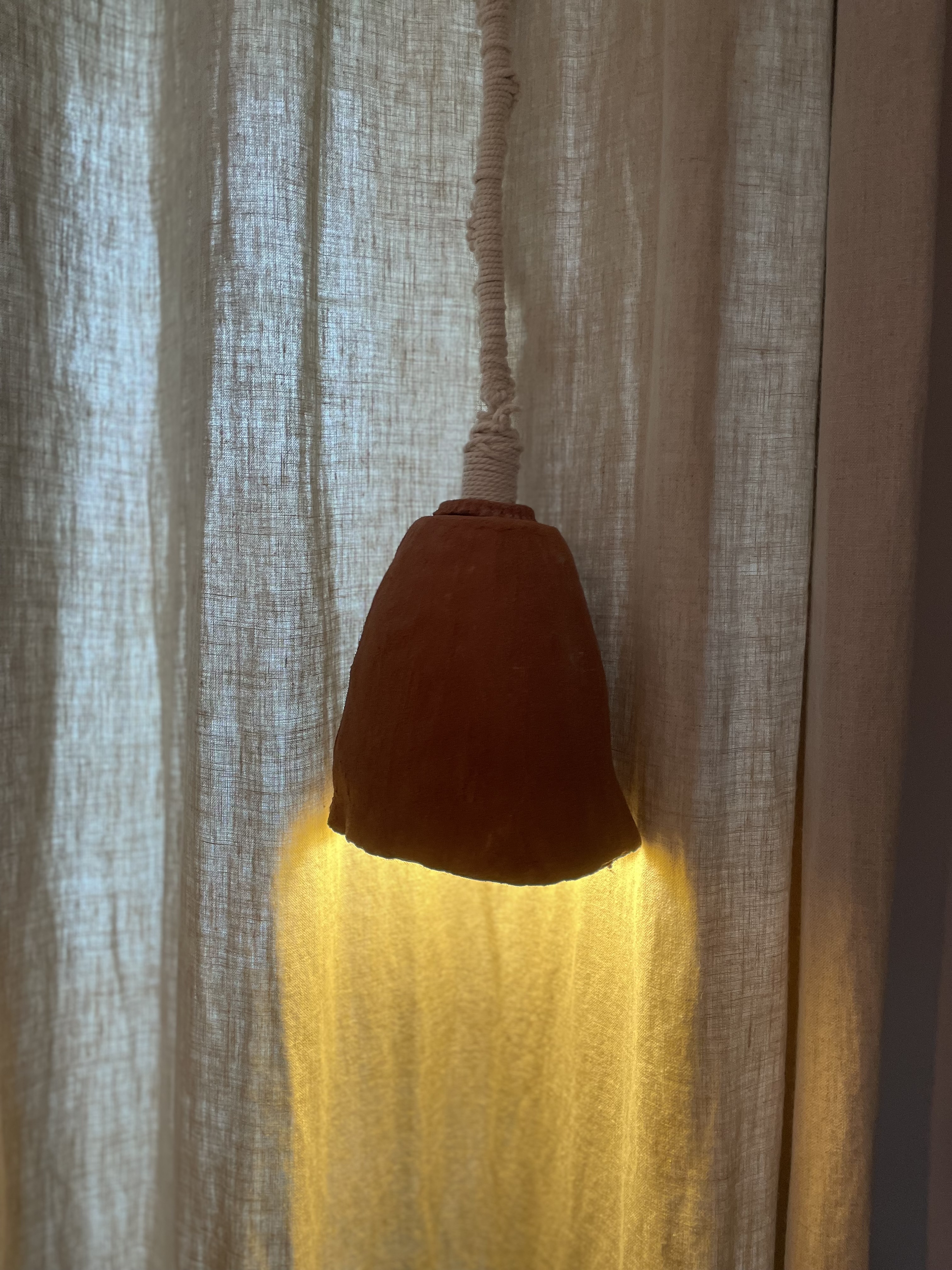 Lampe baladeuse terra cotta, peinture mélangée à du bicarbonate pour un effet texturé. L’intérieur est recouvert de feuille de papier doré.